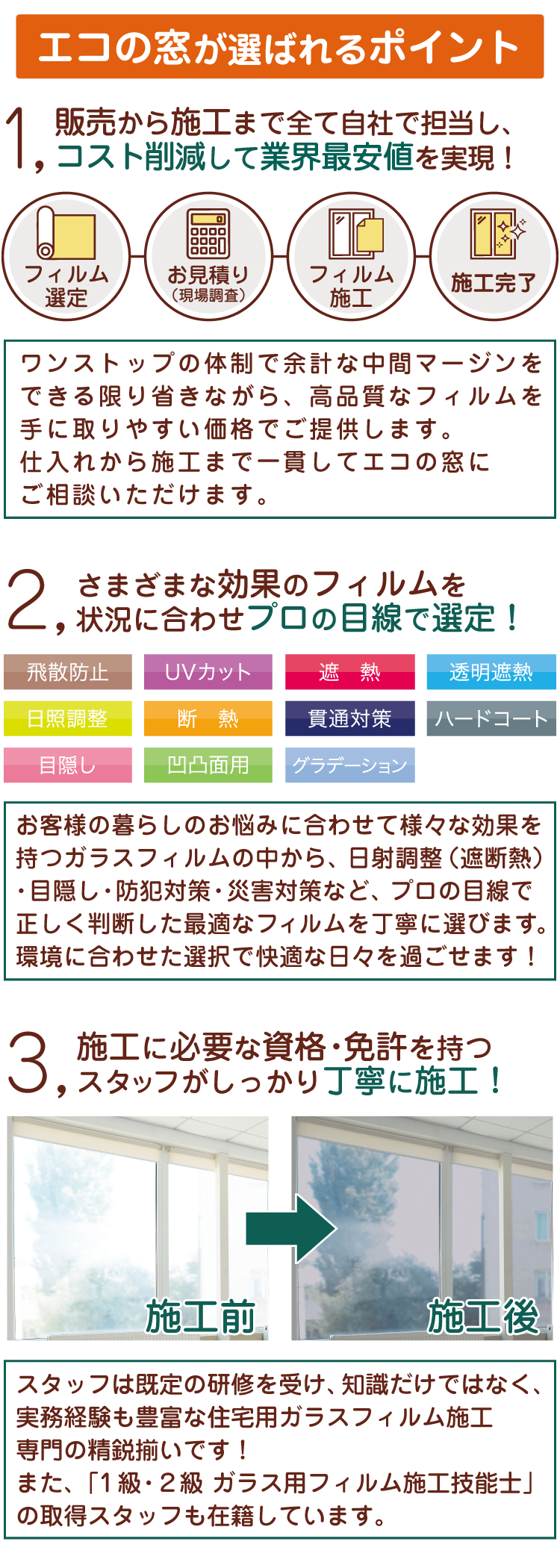 エコの窓 建物に最適な窓ガラス用フィルムをWeb上でご提案 東京・埼玉・神奈川・千葉など関東での窓ガラスフィルム施工はエコの窓にご相談ください! 窓まわりでこのような困りごとありませんか? 種別 ※ 個人法人 お名前 ※ お名前(カナ) ※ 会社名 部署名 メールアドレス ※ 住所 ※ 電話番号 ※ 返信希望手段 ※ メール電話 ※対応時間:平日10~17時どちらでも 施工ご希望時期 ※複数選択可 できるだけ早く1か月以内3か月以内未定 施工を予定しているお住まい ※複数選択可 現在の住居オフィス(事務所)転居先一戸建てマンション新築その他 施工予定のガラスサイズ ガラスサイズ ヨコ cm × タテ cm × 枚 ヨコ cm × タテ cm × 枚 ヨコ cm × タテ cm × 枚 ヨコ cm × タテ cm × 枚 ヨコ cm × タテ cm × 枚 ご希望のフィルム ※複数選択可 遮熱フィルム(ミラー調)遮熱フィルム(透明)防犯フィルム飛散防止フィルム目隠しフィルム装飾フィルム 施工予定の窓の種類 ※複数選択可 一般的な透明ガラス(フロートガラス)型板ガラス(表面に凹凸がある)網入りガラスすりガラス複層ガラスその他 その他ご要望